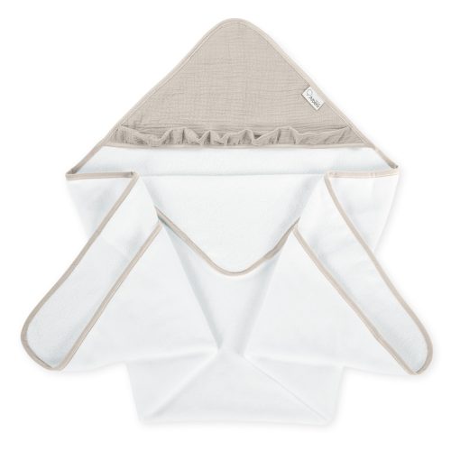 • A termék egyedi jellemzője a puha pamut muszlinból készült kapucni, amelyet bájos fodrok díszítenek. Ezáltal a fürdőlepedő nemcsak praktikus, hanem stílusos kiegészítő is.