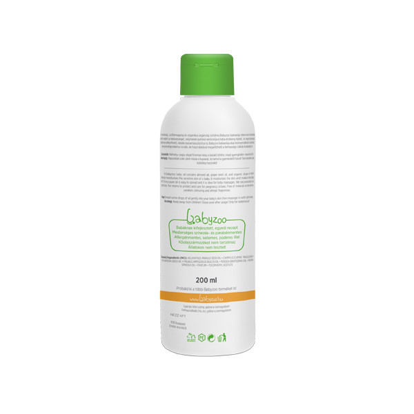 A Babyzoo Babaolaj mandulaolajat, szőlőmagolajat és organikus argánolajat tartalmaz, mely intenzíven hidratálja babád bőrét, megköti a nedvességet, és selymesen puhává varázsolhatja az érzékeny bőrt.