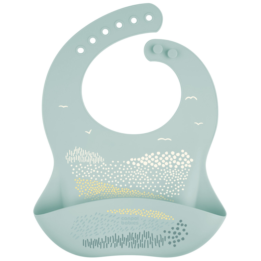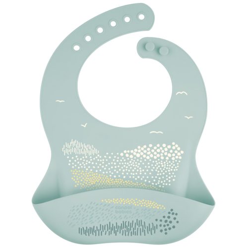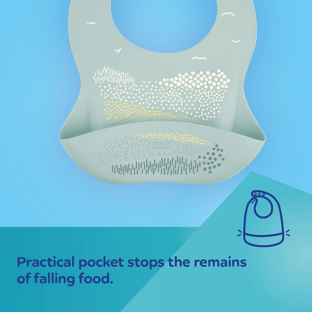 A zsebbel ellátott, vízálló szilikon előke, 100%-ban kiváló minőségű, élelmiszeripari szilikonból készült, így teljesen biztonságos és nem irritálja kisbabád bőrét.