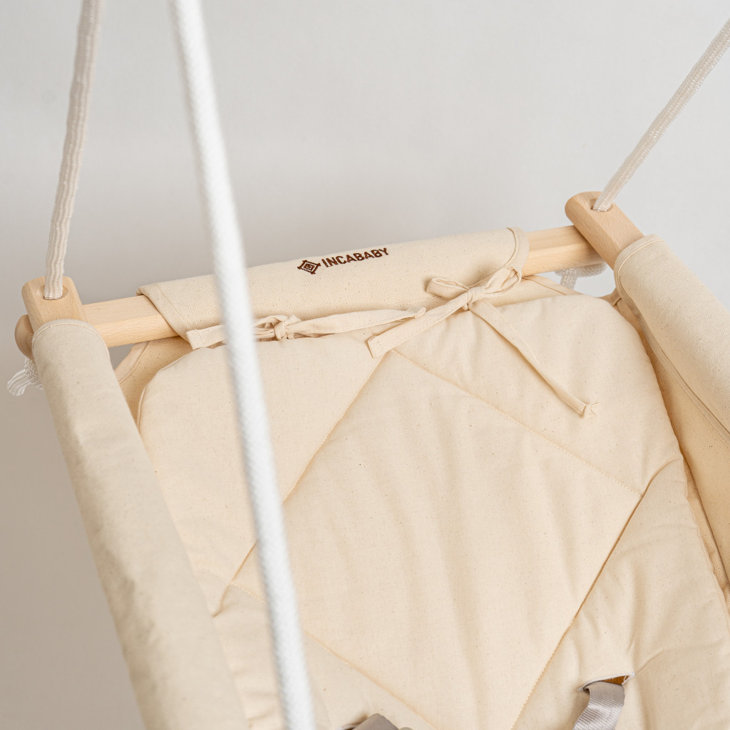 Az Incababy Premium babahinta a beépített 5 pontos biztonsági övvel és 4 oldalon bélelt fog-és fejvédővel, és egyedi márkejelzéssel gravírozott rombusz alakú bükkfa távtartóval gondoskodik kisbabád maximális biztonságáról. Fontos: a biztonsági öv és a fog- és fejvédő a hinta alapfelszereltsége, ezért nem szükséges külön megvásárolni.