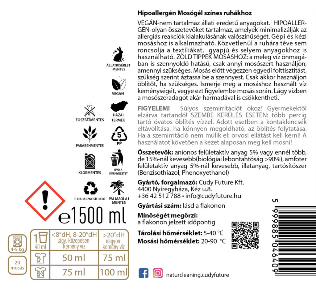 A Naturcleaning Color mosógél nemcsak kíméletes a bőrhöz, hanem hatékonyan távolítja el a szennyeződéseket, miközben megőrzi a színes ruhák élénkségét és puhaságát akár alacsony hőmérsékleten is. Természetes, növényi eredetű összetevői hipoallergén tisztaságot biztosítanak, ezért ideális érzékeny bőrűeknek, kisbabás családoknak és mosható pelenkák mosására is. Nem tartalmaz celluláz enzimet, így nem károsítja az érzékeny textíliákat.