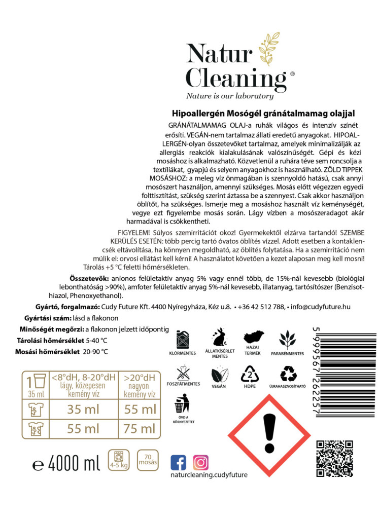 A Naturcleaning gránátalma mosógél segít megőrizni ruháid színét és puhaságát – természetes, környezetbarát módon. Kifejezetten ajánlott érzékeny bőrre és babaruhákhoz is, mivel hypoallergén, bőrbarát és vegán összetevőkből készült. Green Brand díjas, újratölthető flakonos termék – mert a fenntarthatóság nem luxus, hanem döntés.