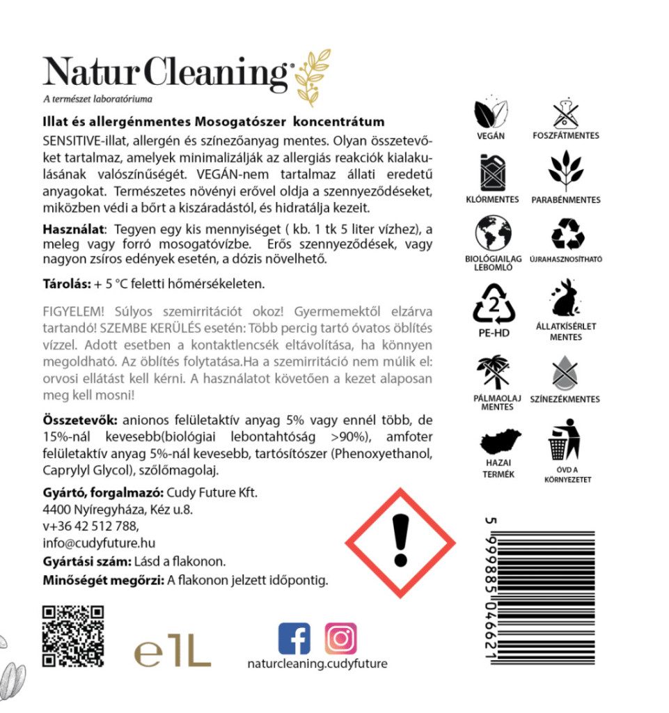 A NaturCleaning illat- és allergénmentes mosogatószer koncentrátum tökéletes választás azoknak, akiknek érzékeny a bőrük, vagy tudatosan kerülik az illatanyagokat és allergéneket. A vegán, természetes alapú formula nem tartalmaz foszfátot, klórt, parabéneket, pálmaolajat és semmilyen szintetikus illatanyagot. Ideális családoknak, kisgyermekes háztartásoknak, allergiásoknak és mindenkinek, aki a természetes tisztaság híve.