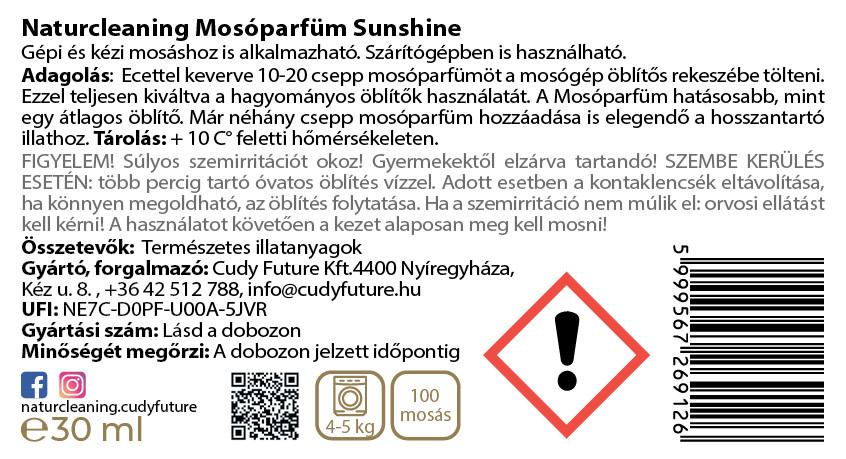 Fedezd fel a napsütötte frissesség élményét a Naturcleaning Sunshine mosóparfümmel! Ez a természetes illatanyagokból készült, hiperkoncentrált mosóparfüm tökéletes alternatívája a hagyományos öblítőknek – erősebb, tisztább, tartósabb illattal.