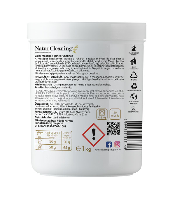 A Naturcleaning Color mosópor tökéletes választás, ha szeretnéd, hogy színes ruháid élénkek maradjanak, miközben makulátlanul tiszták lesznek. Kíméletes a textíliához, mégis erőteljes a foltokkal szemben – már alacsony hőmérsékleten is!