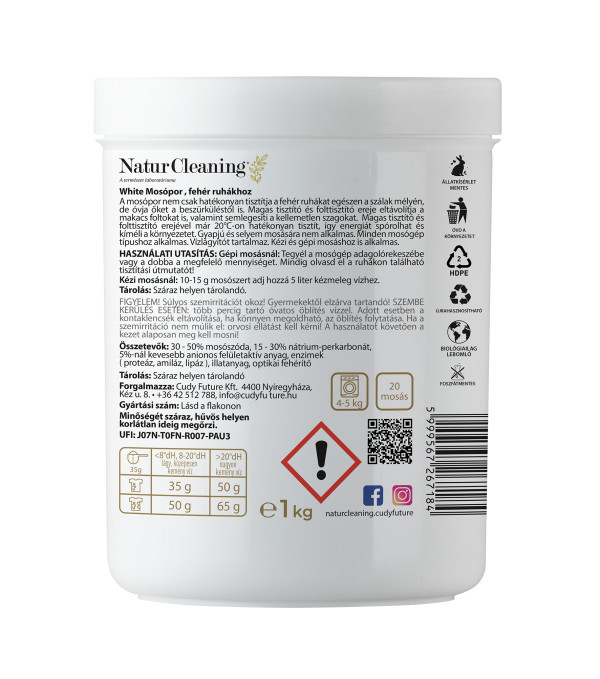A Naturcleaning White mosópor célzott megoldást nyújt a fehér ruhák tökéletes tisztaságához. Megakadályozza a beszürkülést, eltávolítja a makacs foltokat, és hosszan tartó frissességet biztosít – anélkül, hogy kompromisszumot kellene kötnöd a környezetvédelem terén!