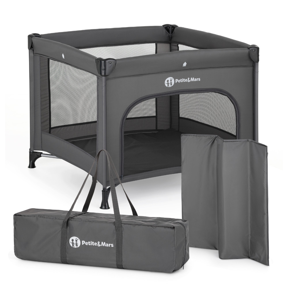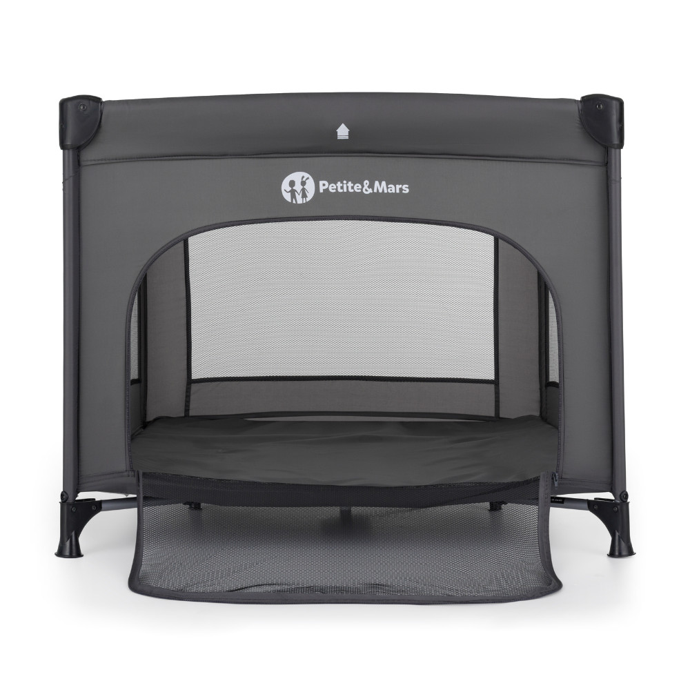 A járóka elegendő helyet kínál a játékhoz és a rövid pihenéshez is. A hálós oldalpanelek optimális légáramlást biztosítanak, és lehetővé teszik a gyermek számára, hogy figyelje a környezetét. A praktikus, nyitható oldal megkönnyíti az önálló be- és kiszállást, amit különösen a nagyobb gyermekek értékelnek. A modern, semleges sötétszürke dizájn könnyedén illeszkedik bármilyen enteriőrbe.