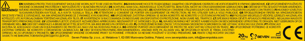 FIGYELMEZTETÉS! VÉDŐFELSZERELÉST KELL VISELNI. KÖZLEKEDÉS SORÁN TILOS HASZNÁLNI. Gyártó/Forgalmazó: Seven Polska Sp. z o.o., ul. Metalowa 1, 62-095 Murowana Goślina, Lengyelország, info@sevenpolska.com, PL7773359971