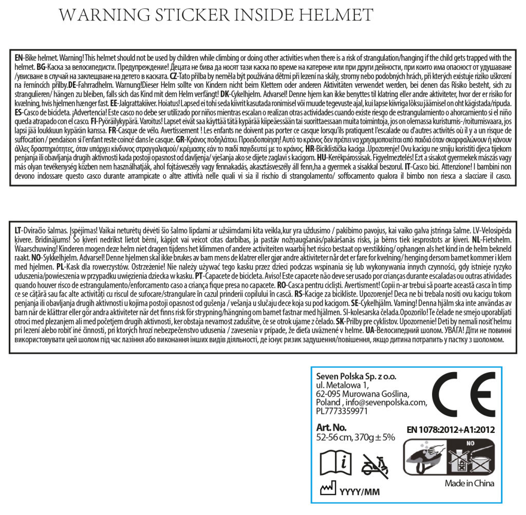 FIGYELMEZTETÉS! EZT A SISAKOT GYERMEKEK NEM HASZNÁLJÁK MÁSZÁS VAGY EGYÉB TEVÉKENYSÉGEK KÖZBEN, AMELYEKKEL FENNTARTJA A FOJDALÁS/AKADÁS VESZÉLYE, HA A GYERMEK BECSAPDULKODIK A SISAKBA. Gyártó: Seven Polska Sp. z o.o., ul. Metalowa 1, 62-095 Murowana Goślina, Lengyelország, info@sevenpolska.com, PL7773359971