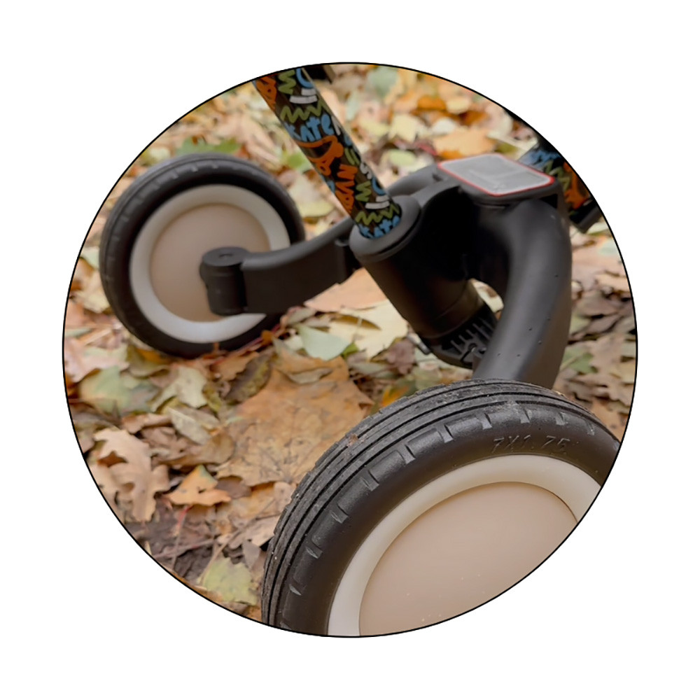 Biztonság és kényelem: A kormány csúszásmentes gumifogantyúkkal állítható, a pedálok levehetők, az ülés magassága pedig szabályozható. Az állítható biztonsági övek stabilitást és biztonságot nyújtanak még gyorsabb haladás közben is. A strapabíró gumikerekek sima haladást biztosítanak különféle felületeken, akár két-, akár háromkerekű módban.
