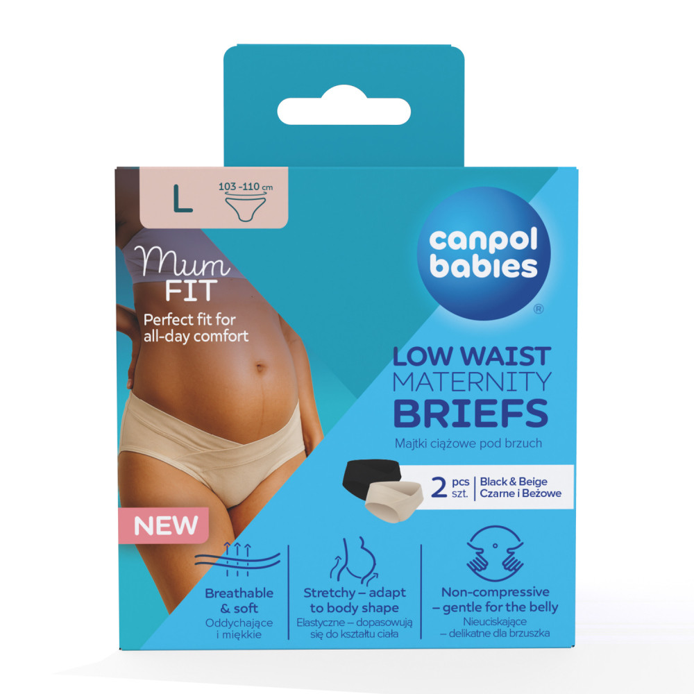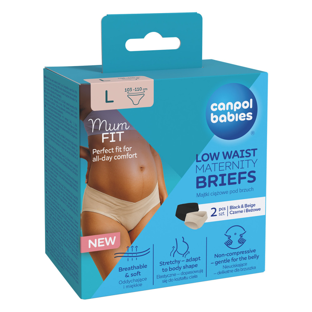 Kényelmes kismama bugyi puha pamutból, bézs és fekete színben, rugalmas derékrésszel és a pocak alatti íves alacsony derekú kialakítással, amely maximális kényelmet biztosít a terhesség ideje alatt.